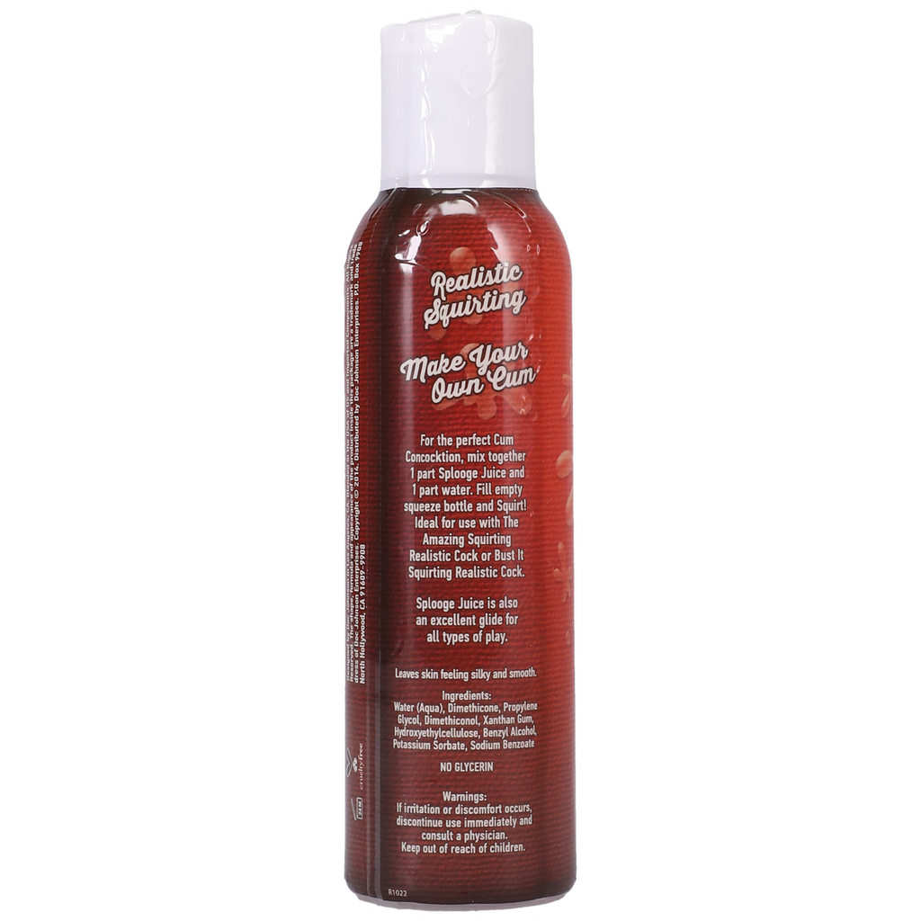 The perfect cum-like concocktion! Designed to emulate the look and feel of actual cum, Splooge Juice is the perfect companion to your favorite Doc Johnson squirting cock or for use during couples play, and solo fun! Hybrid Water-based & Silicone Formula. 4 oz. Bottle. Proudly Made in America.
